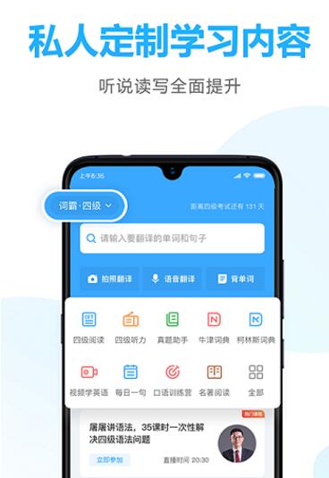 覆盖高中、四六级、考研、雅思、托福身份,支持个性化定制,一键同步学习计划,听说读写专项练习,智能背单词,提高记忆效率。