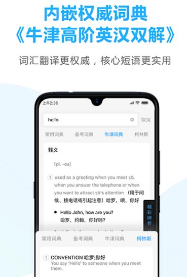 4、全面收录《柯林斯COBUILD高阶英汉双解学习词典》:权威学习型词典。集英汉、英英、例句于一体,内容精选于43亿词语、口语和书面语并重的语料库。