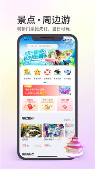 同程旅行是一款功能非常强大又实用的在线订票软件,是专门为用户旅行所设计的。用户能在这里查询到全国各地的景点门票、周边游乐设施和各种景点的详细信息,可以让用户提前了解当地又什么活动。同时也能随时随地的抢火车票和飞机票,每天都会有特价机票,不定时发放优惠活动,能让用户少花钱。还为用户提供了酒店、国外度假、景点票、火车票等旅游产品的预订。