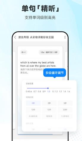 2、播放调节:8档语速调节、4种循环模式,单句精听、听写、测验,满足不同阶段学习需求;
