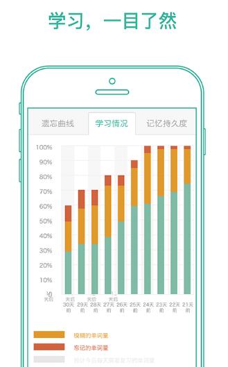 * 记忆持久度:你可以清楚地看到已学单词的熟知度情况。