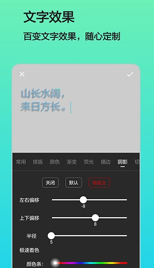 渐变、荧光、描边、阴影、切割,你能想到的,你想不到的文字处理效果我们都为你提供了,充分发挥你的创意,各种酷炫的文字效果等你来创作,你就是社交平台上最有格调的仔