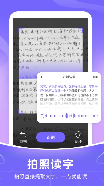 1.拍照、广播、拍照,可以自动识别文字,用语音阅读。