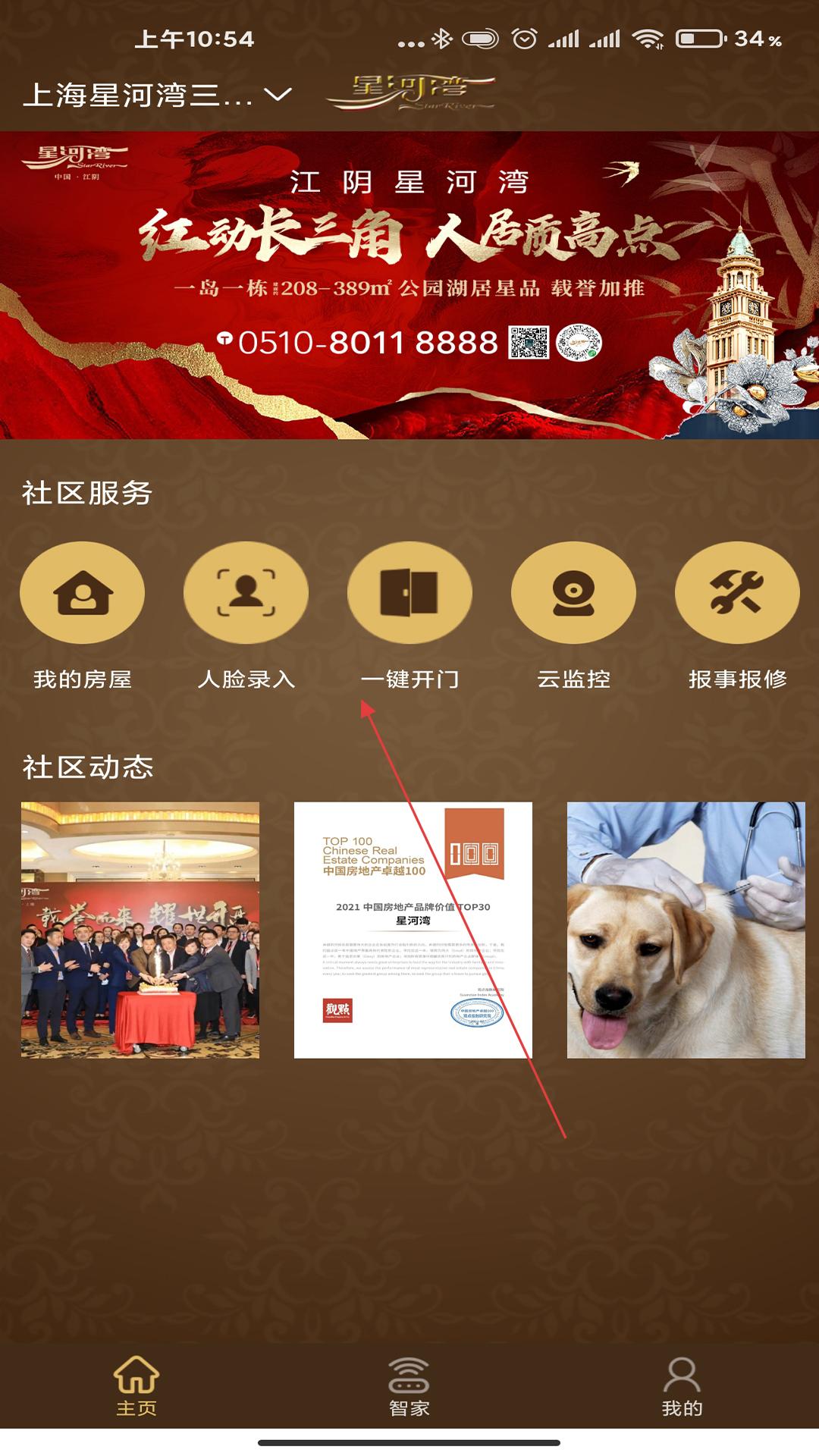 2、在首页,选一键开门等功能,操作门禁,查看社区动态,了解物业资讯。