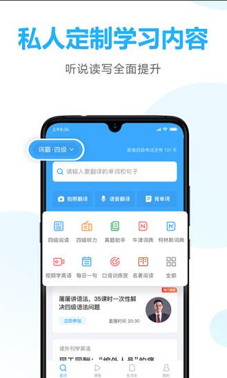 4、考研、托福、雅思、职场,选择开启量身打造的学习计划,听说读写专项练习。