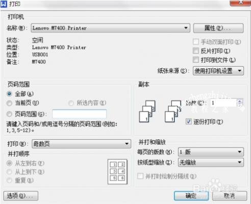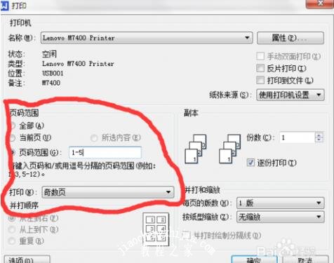 二、页码范围选择“全部”,然后在页码范围下面的“打印”选择“奇数页”。如果你怕打错,可以先用一张纸实验一下。试验一下就在页码范围写上“1-5”或者“1”。数字就是代表页码。你想打哪一页就填上哪个页码数字。其余的不要动,选择确定就可以了。