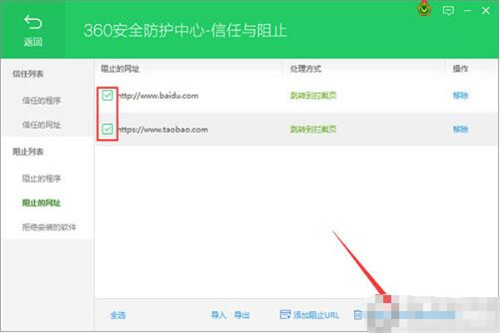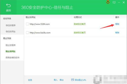 3、若想删除一个或多个网址,先选中相应网址,然后单击“从阻止列表中移除已选网址”即可。