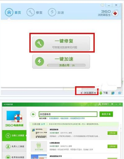 方法四:修复360浏览器一是可以使用浏览器自带的浏览器医生功能进行修复,点击浏览器医生,选择一键修复即可。二是使用360安全卫士的360电脑救援功能,打开电脑救援,输入“浏览器崩溃”,即可出现各种浏览器崩溃问题的修复功能,点击修复就行了。