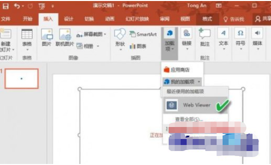 4、然后打开PPT,点击“插入”中的“加载项”选项,加载Web Viewer就可以轻松插入网页了。