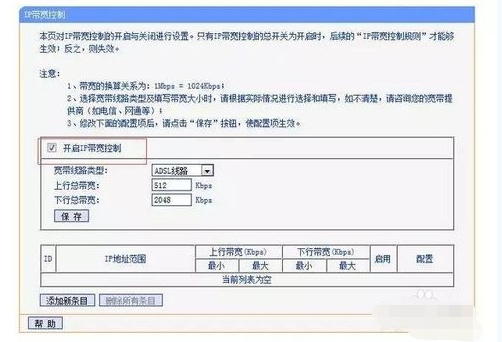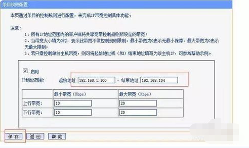 点击“添加新条目”按钮!然后最重要的是这个规则设置了, 自己的IP可以避开这个规则,如果你自己的IP为192.168.1.254 ,你可以设置地址段为192.168.1.2 - 192.168.1.253,然后再下面输入其他设备的最高带宽和最低带宽就行!就基本可以控制所有路由器里面他人的网速了
