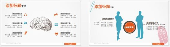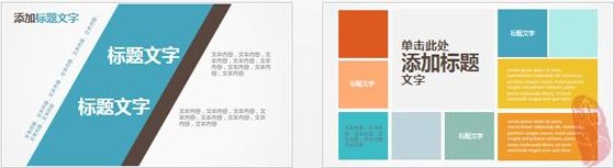 左边:不规则的色块与文字相结合很是提神,由于色块角度的倾斜打破了习惯性视觉,在提神的同时也会给浏览者造成一定的不适,建议在PPT页面排版中零星使用。