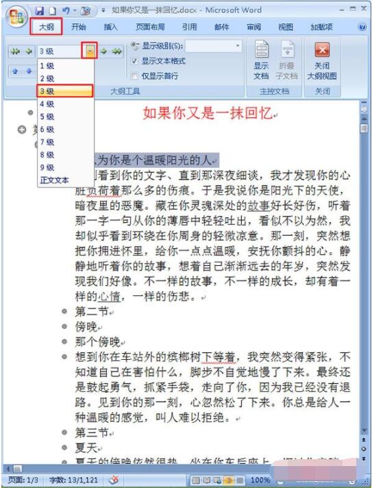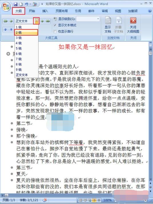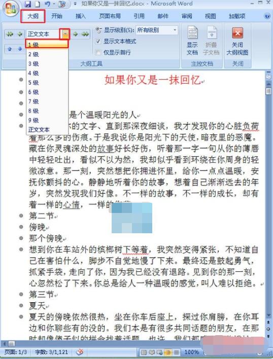2.在“大纲”选项卡功能区域,我们需要把生成目录的标题进行一个级别的划分,选中文章中的主标题,单击“正文文本”后面的下拉按钮,在弹出的下拉菜单中选择“1级”命令,相应的依次轮推,选中副标题设置为2级,小标题为3级等,具体的做法如下图;