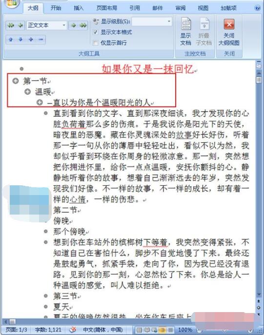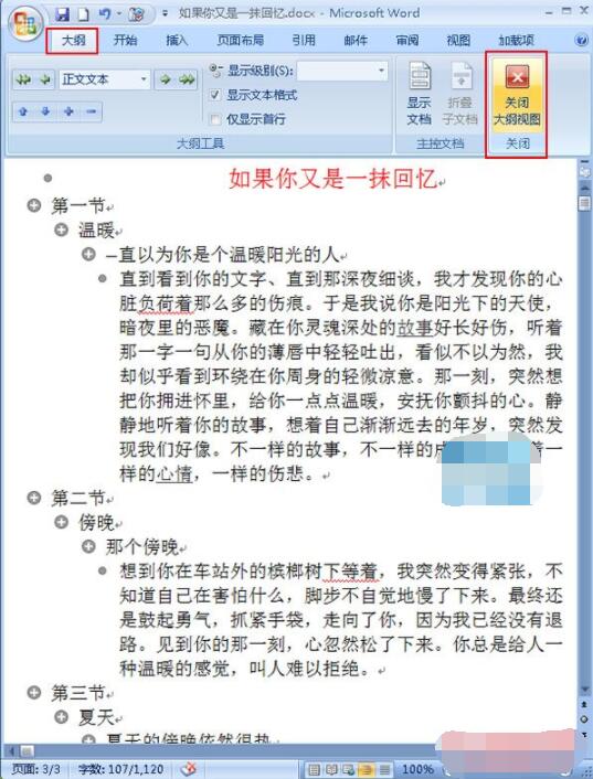 4.设置完毕后,在“大纲”选项卡区域单击“关闭大纲视图”选项组,将其关闭;