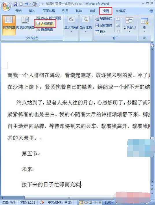 1.首先打开一篇需要自动生成目录的Word原始文档,单击“视图”选项卡,选择“文档视图”中的“大纲视图”选项组;