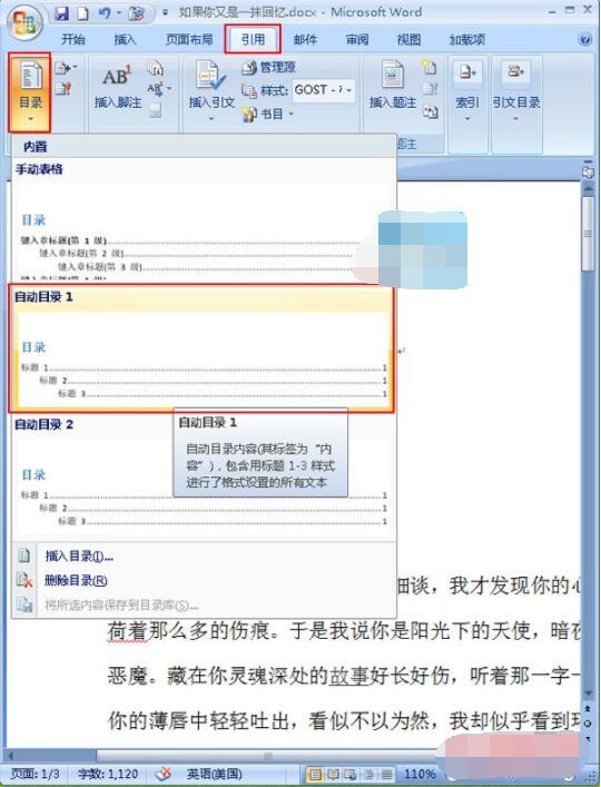 5.关闭后返回到页面视图中,我们将光标定位在需要添加目录的地方,小编在这里先将其定位在顶部,之后单击“引用”选项卡,在“目录”区域单击“目录”选项组,在弹出的下拉菜单中选择“自动目录1“命令;
