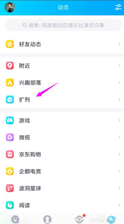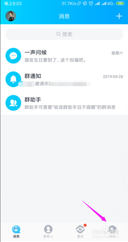 QQ扩列怎么添加好友,来到QQ主页,点下【动态】,如图。