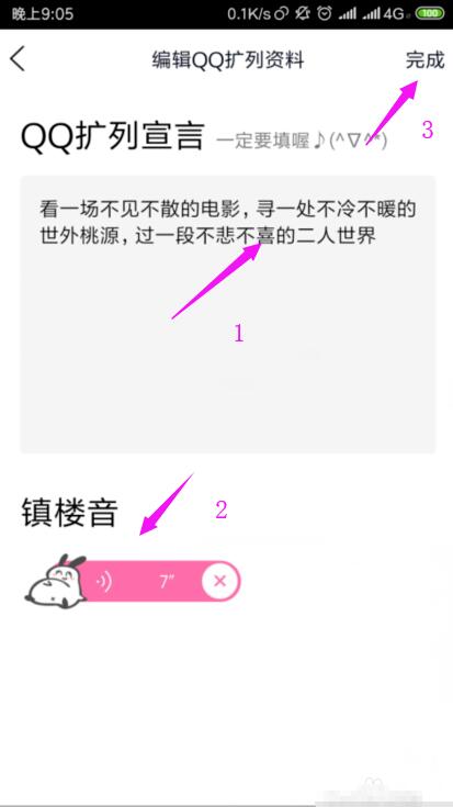 接着输入我们的【宣言】,录入我们的语音介绍,最后点【完成】,如图。