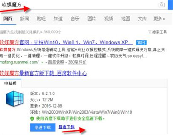 1、网页搜索软媒魔方,看到官方版后点击普通下载。