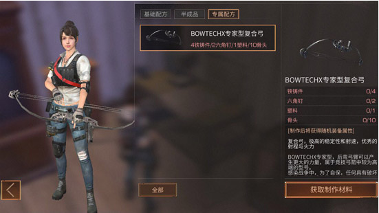3、复合弓:射程远,伤害高,复合弓用来打猎或者远程偷袭都是不错的选择,前期的话,材料会比较难刷一点,但是复合弓的作用比UZI强,适用于各种地图。