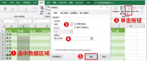 注意第 ❹ 步里「来源」这里输入的各种选项是用英文半角符号,隔开的,最后点击【确定】即可。
