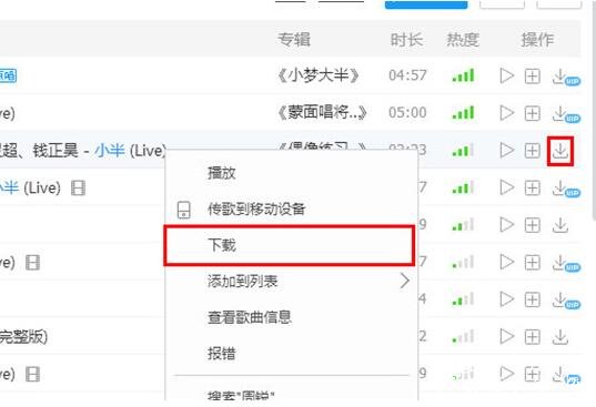 3、鼠标右键点击选择的那首歌曲,在新出现的下拉栏目中点击“下载”选项,或者直接点击歌曲右方的“下载”图标选项进行下载,在下载图标上显示蓝色VIP标识的图标则需要办理VIP会员才可以下载,如下图所示: