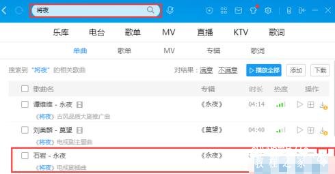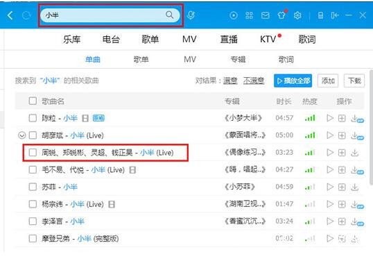 2、在上方的搜索栏中输入自己想要下载的歌曲名字或歌手名字,将会在下方出现相关的搜索结果,由于小编现在的账号不是会员,就为大家来演示下载不需要会员的歌曲吧,如下图所示: