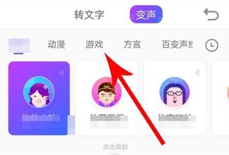 3、紧接着我们就可以看到“变声”界面,在该界面可以根据自己的需求进行变声种类的选择,包括了动漫、游戏、方言等等,选择一项即可。