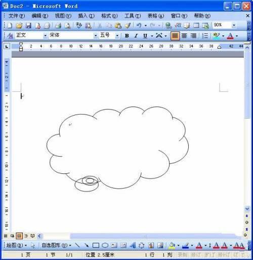 2、进入Word中,利用“绘图”工具栏上的相关按钮,根据裁剪的需要,在文档中绘制出一个封闭的异形图形。此处,为了方便,我们直接用“云形标注”自选图形来操作(如图1)。