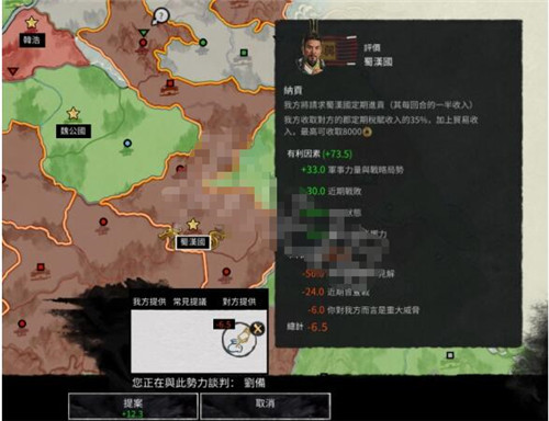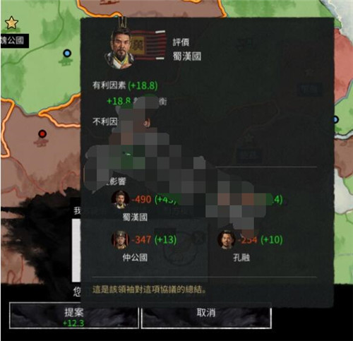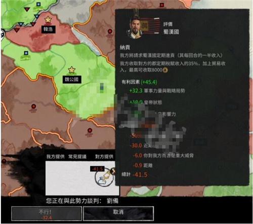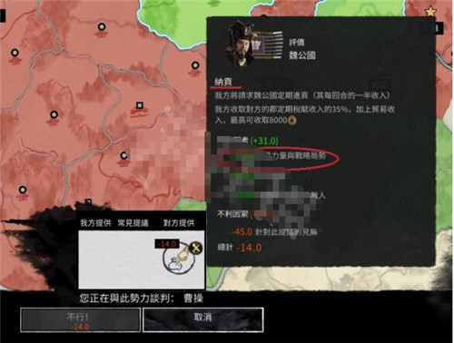 军事力量的部分比较简单,电脑会依据你的军事强度的差异给出不同的外交让步,同盟军的战力、我方军势与敌方城镇的距离也都会算进去。
