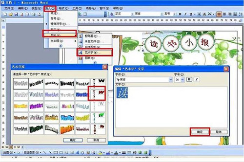 4、设置小报主题。点击插入——图片——艺术字——选择一种艺术类型输入文字,如这里分别写上读书小报四个艺术字摆放在四个小圆那里。