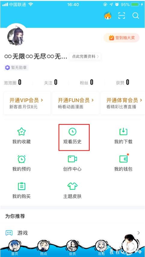 2、在我们点击下面的我选项后,出现一个我的管理窗口,看到里面有一个播放记录的选项,我们选定它,然后点击打开它。