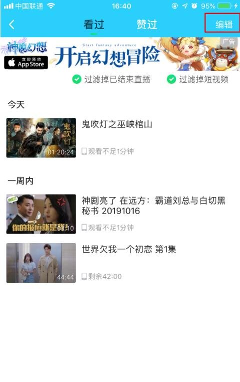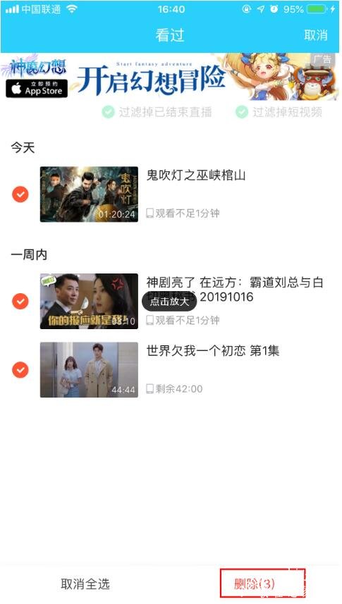 4、看到我们已经播放过的电影,接下来我们把手指移动上去,点击下,出现一个选定电影进行删除的界面。