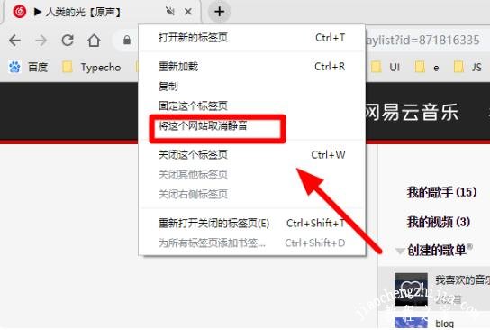 2、如果需要将关闭的声音恢复,可以重新右击被关闭声音网页的标签页,然后点击“将这个网站取消静音”按钮: