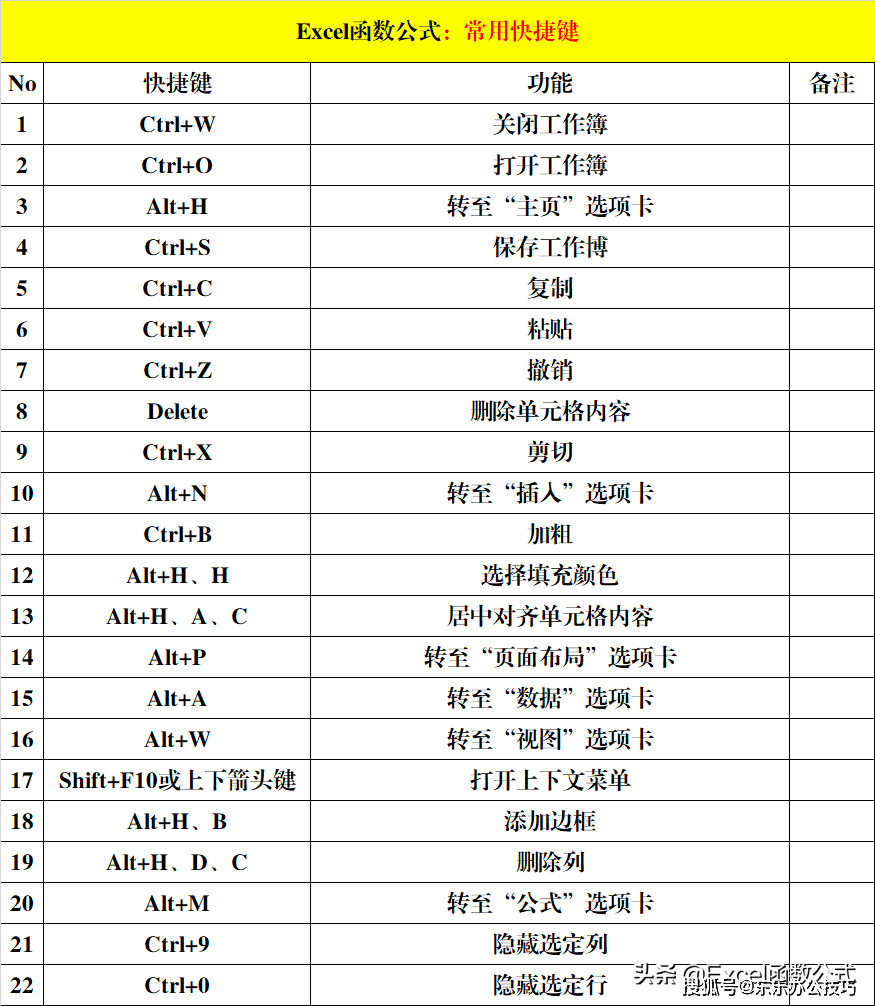 一、Excel快捷键:常用快捷键(22个)。