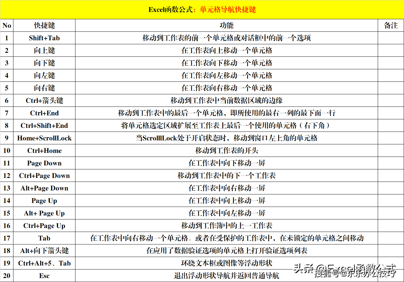 四、Excel快捷键:单元格导航快捷键(20个)。