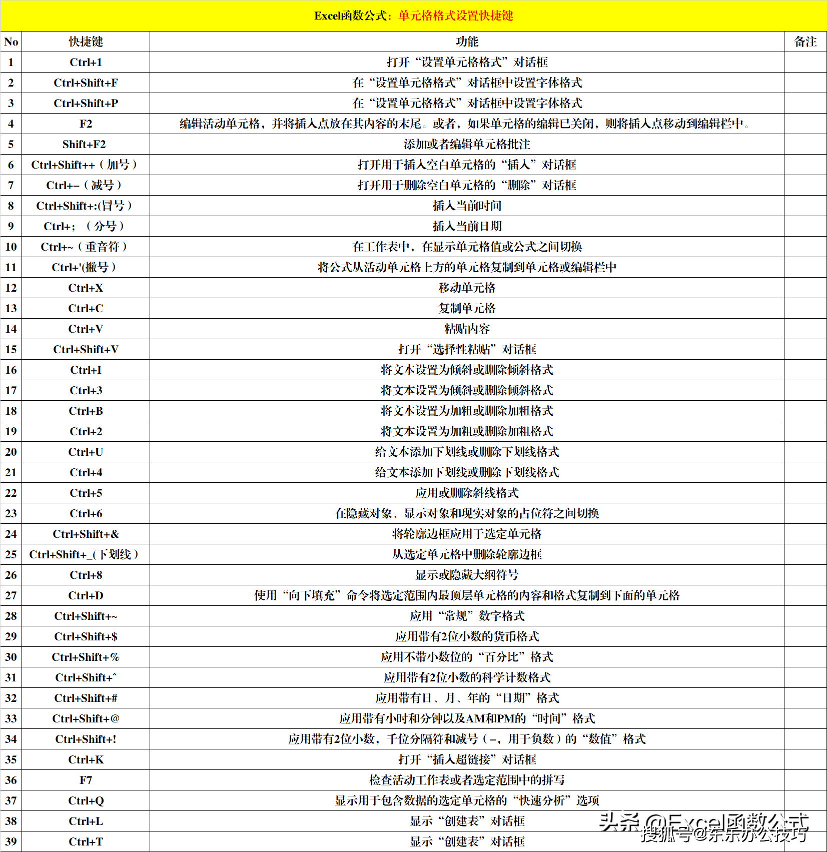 五、Excel快捷键:单元格格式设置快捷键(39个)。
