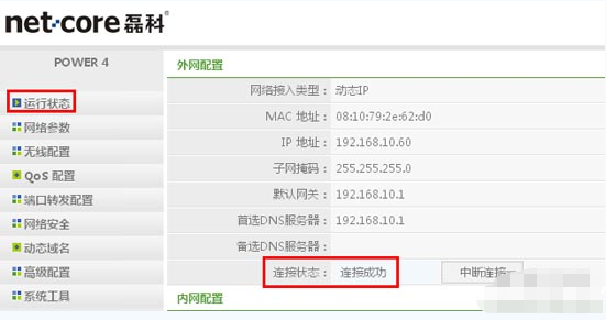 2、点击“运行状态”——》查看右侧的“连接状态”,如果显示:已连接。表示无线路由器上网设置成功。