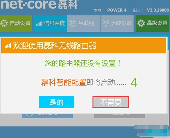 温馨提示:磊科无线路由器中的智能配置,“网络接入类型”有时候会识别不准确,造成设置后无法上网的问题。所以,这里选择“不需要”,然后手动设置磊科无线路由器连接Internet。