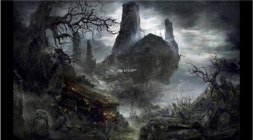 出门上坡穿越一堆骷髅的墓地,穿过四足骷髅残破桥,上楼梯右拐,再上楼梯,再右拐下楼梯到一堆四足骷髅的平台。推荐处理掉所有怪,在悬崖处墓碑上捡龋
