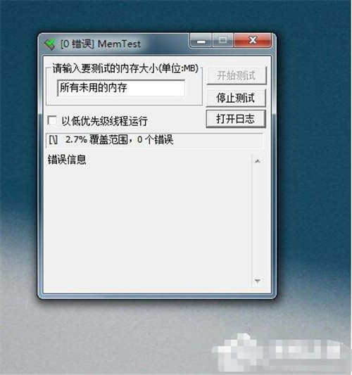 3、当测试完成或停止测试后,用户想要了解具体的内存测试详情,就可以点击“打开日志”选项打开日志,查看已经测试完的内存与错误,这样也就完成了检测内存的全部内容。