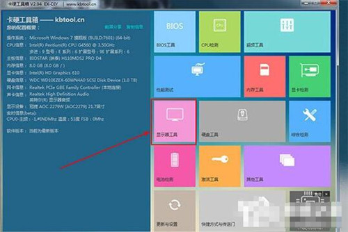 1、在卡硬工具箱的主界面,大家可以看到自己电脑中的各个硬件配置,其中也包括自己的显示设备,也就是所谓的显示器型号了,虽然可以在配置概要中了解整体的数据,但还是不能够知道显示器是否存在坏点等现象,用户需要点击“显示器工具”选项进行功能的查找;