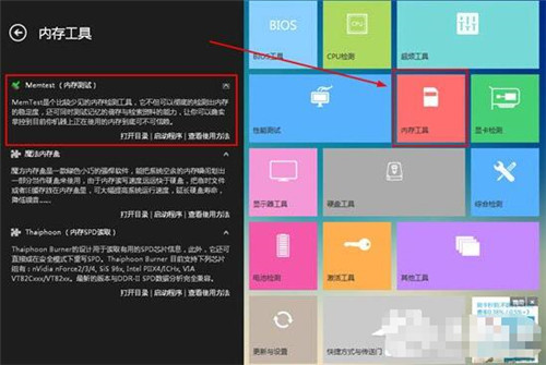1、其实软件已经为用户分好类检测的不同类型,如果你想要检测内存,只需要点击其中的“内存工具”,找到其中的“Memtest(内存测试)”的选项启动此功能;