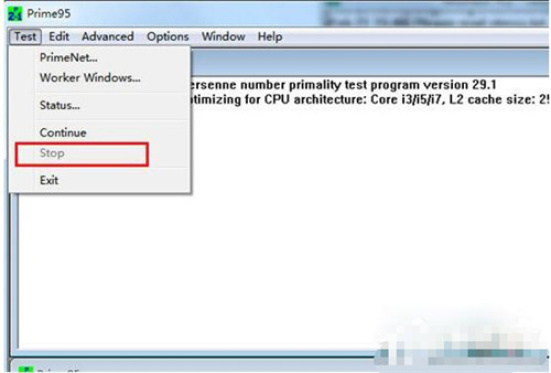 3、一般情况下,测试CPU的时间为6到24小时,如果CPU当真有硬件性能问题的话,可能在几分钟内就会出现异常情况,比如死机,重启,自动断电等突发情况,如果要停止测试,请点击软件左上角菜单栏中“Test”中的“Stop”,然后再点击“OK”按钮即可停止所有测试,如下图所示: