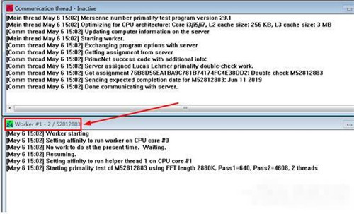 2、弹出Prime95的界面后,接着就可以开始对当前电脑的CPU进行压力测试了,小编的电脑使用的是双核心的处理器,也就是红框标注内看到的“Work #1-2”,每一个Work区表示一个逻辑CPU核心,如下图所示: