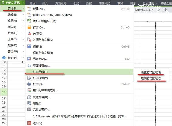2、单击“文件”菜单。选择“打印区域”,选择“设置打印区域。”如果不想要已经设置好的打印区域,可以这样取消打印区域。左键单击“文件”菜单。选择“打印区域”,选择“取消打印区域。