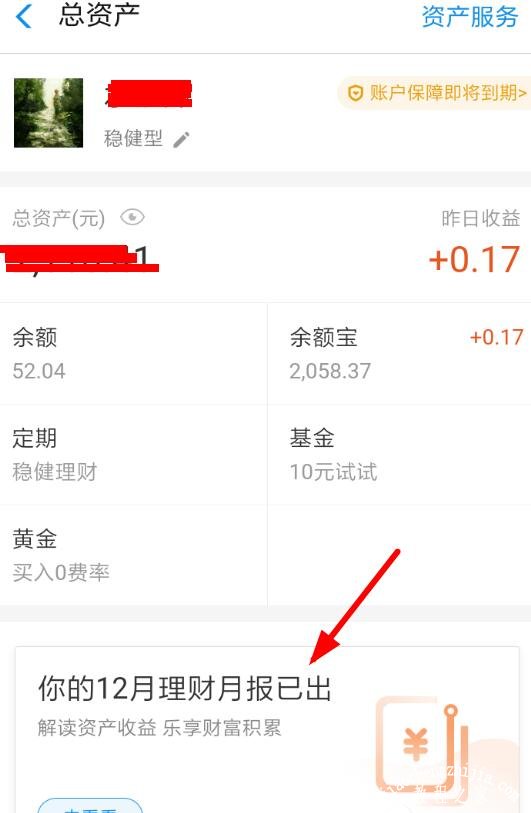 2、跳转到了总资产页面之后,我们就可以从底端找到上个月的理财月报了,点击即可查看月报的详细信息;