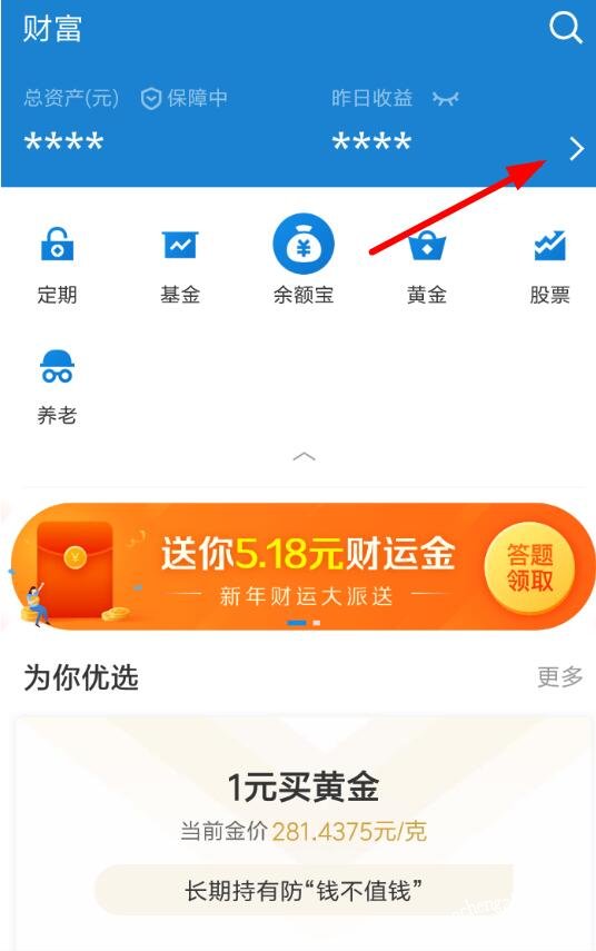 1、其实查看理财月报的方法并不复杂,用户打开支付宝首页之后需要点击底端的“财富”分类,然后选择上方的收益数据右侧的按钮(如下所示);