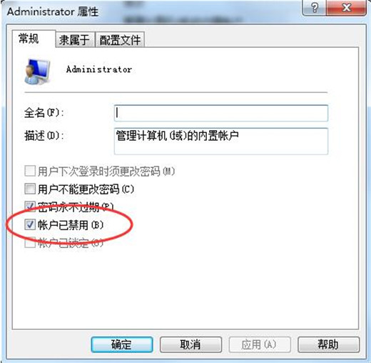 5.在出现的界面中将“账户已禁用”选项前面的勾去除,然后点击应用并确定即可。