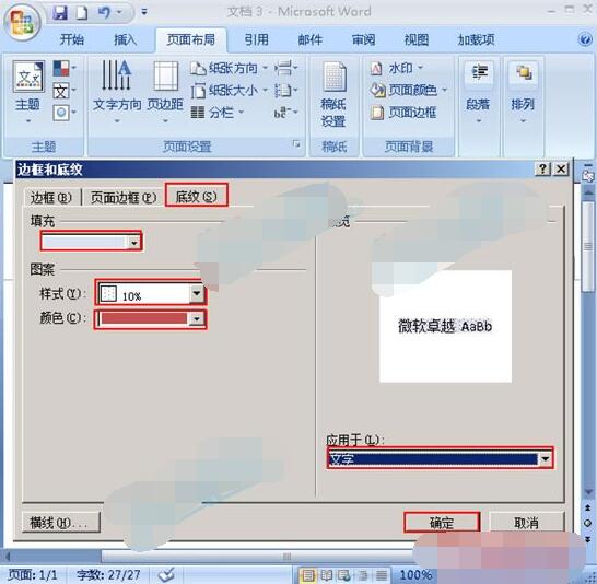 2.弹出“边框和底纹”对话框,点击“底纹”选项卡,“填充”颜色,“图案”里的“样式”和“颜色”自己喜欢什么选什么,“应用于”选择文字,然后点击确定。如下图。