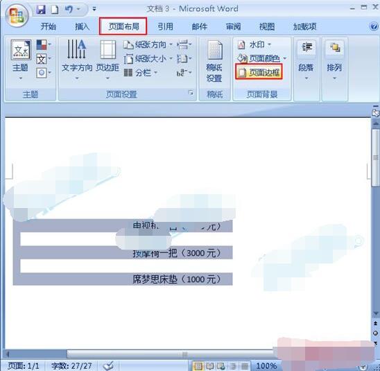 1.选中要添加底纹的Word文本,然后切换到“页面布局”选项卡,单击“页面背景”中的“页面边框”选项。如下图。
